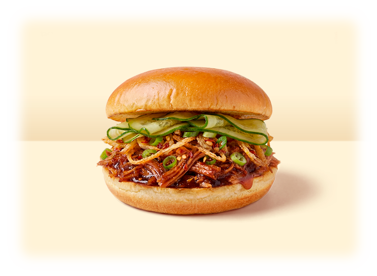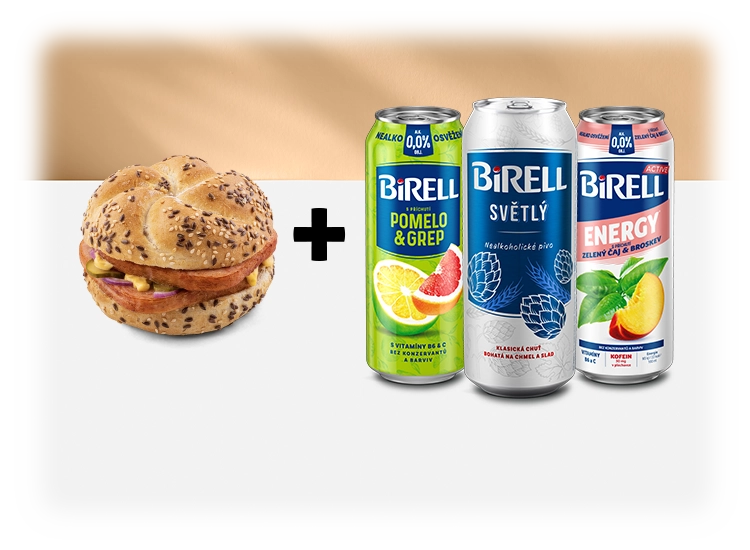 dvojitá porce sekané zapečené v kaiserce s trochou kyselé okurky a červené cibulky